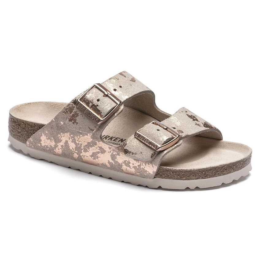 The BIRKENSTOCK Arizona is a genuine classic with its timeless design. This version features a metallic foil with a vintage look. The creative production process means that no two pairs are the same. The color-coordinated footbed and the buckles round off the shoe’s look of sophistication. The upper is made from soft suede.