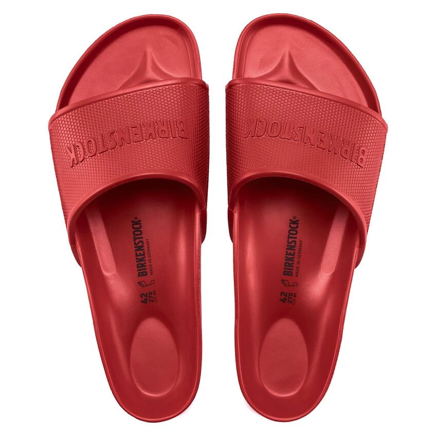 The BIRKENSTOCK Barbados is a sporty slide design with an embossed upper and logo lettering. Modeled on the cork sandal, this sandal is made from one piece of light, flexible and waterproof molded EVA.