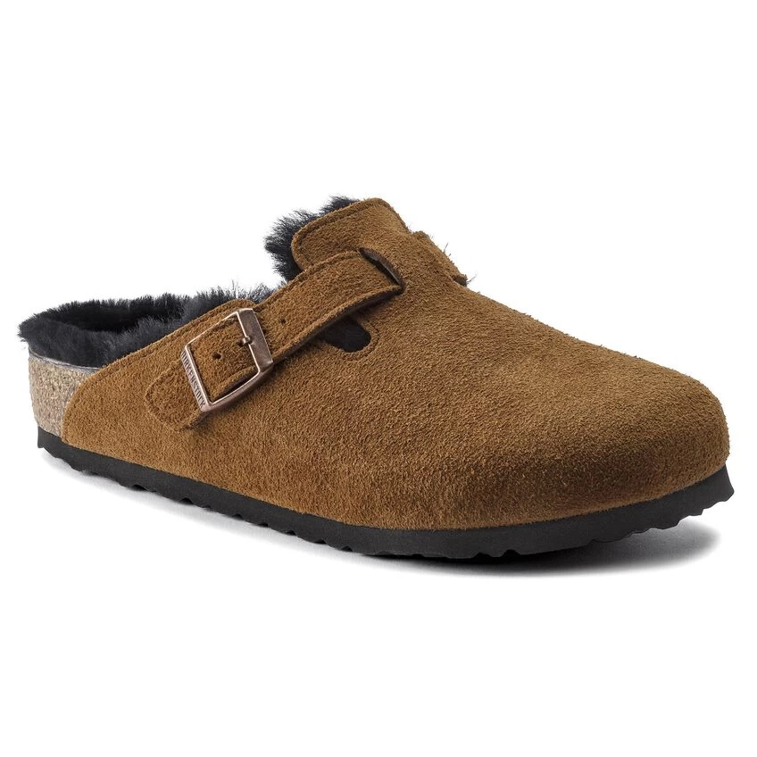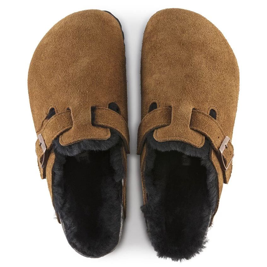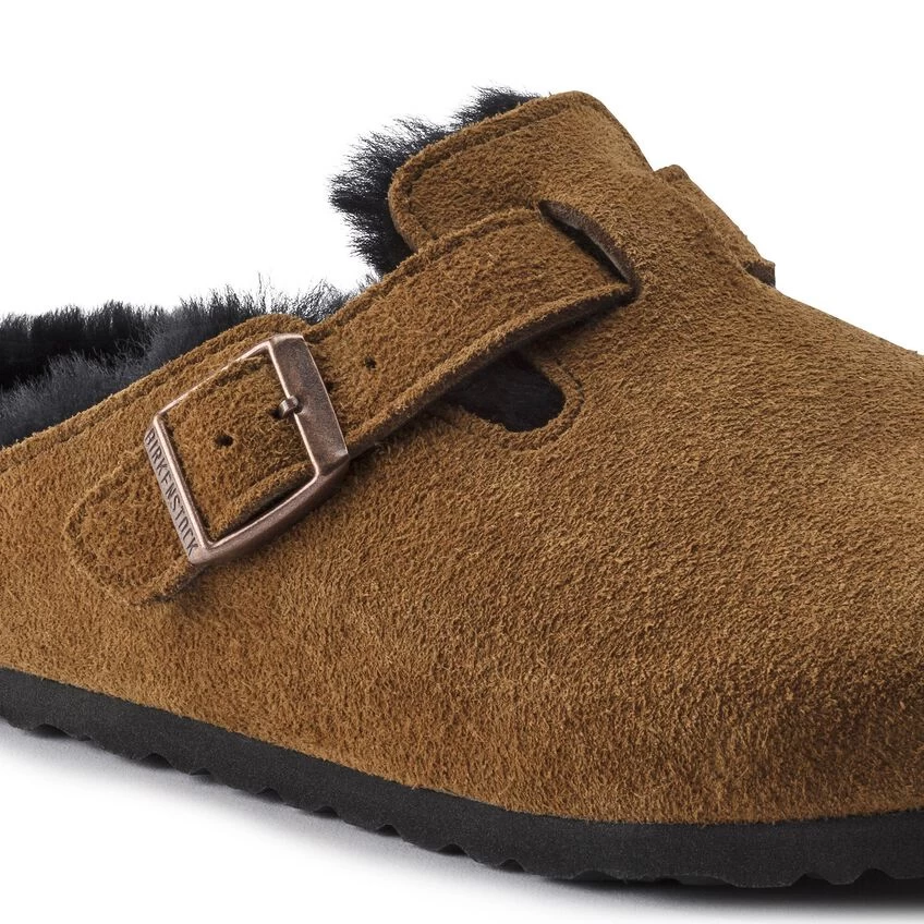 The signature slip-on clog from BIRKENSTOCK – the Boston. A casual-wear staple that is perfect all year round with a simple, adjustable design and contoured cork footbed that forms to the shape of your foot. Here, the classic model comes in a particularly cozy version with soft shearling lining. The perfect shoe for cozy winter evenings! The upper is made from soft suede.