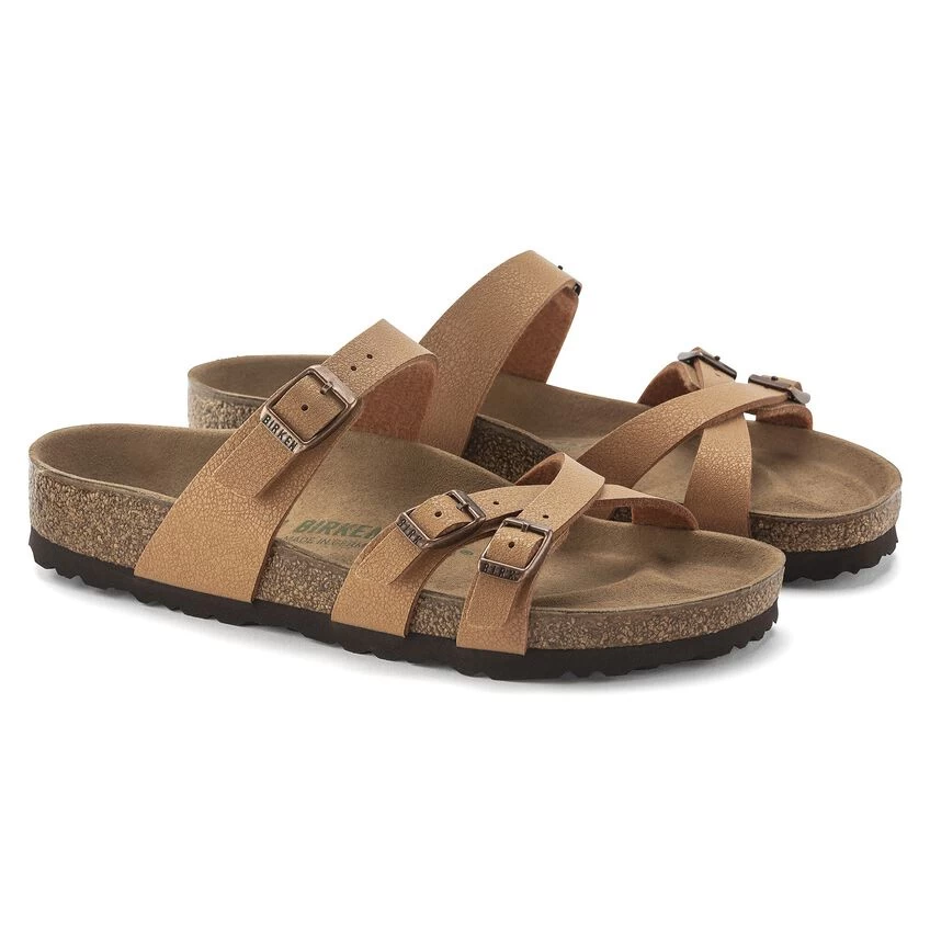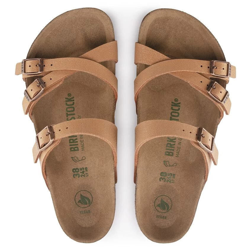 The BIRKENSTOCK Franca is an elegant model designed with slim, stylish crisscrossed straps. Featuring an impressive combination of design and wearability for all day comfort. Now available in vegan materials. The upper is made from the skin-friendly, hard-wearing synthetic material Birkibuc.