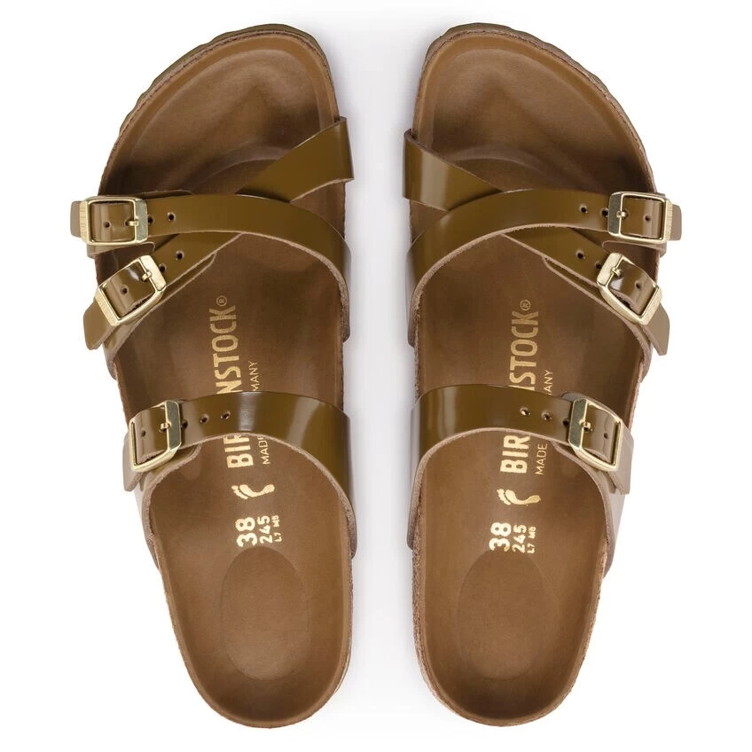 Sleek, crisscross straps with the comfort to match. The Franca’s strappy, style-forward design features premium natural leather with a shiny patent coating for statement-making sheen. Complete with classic BIRKENSTOCK design elements, like a contoured cork-latex footbed for the ultimate in all-day support.