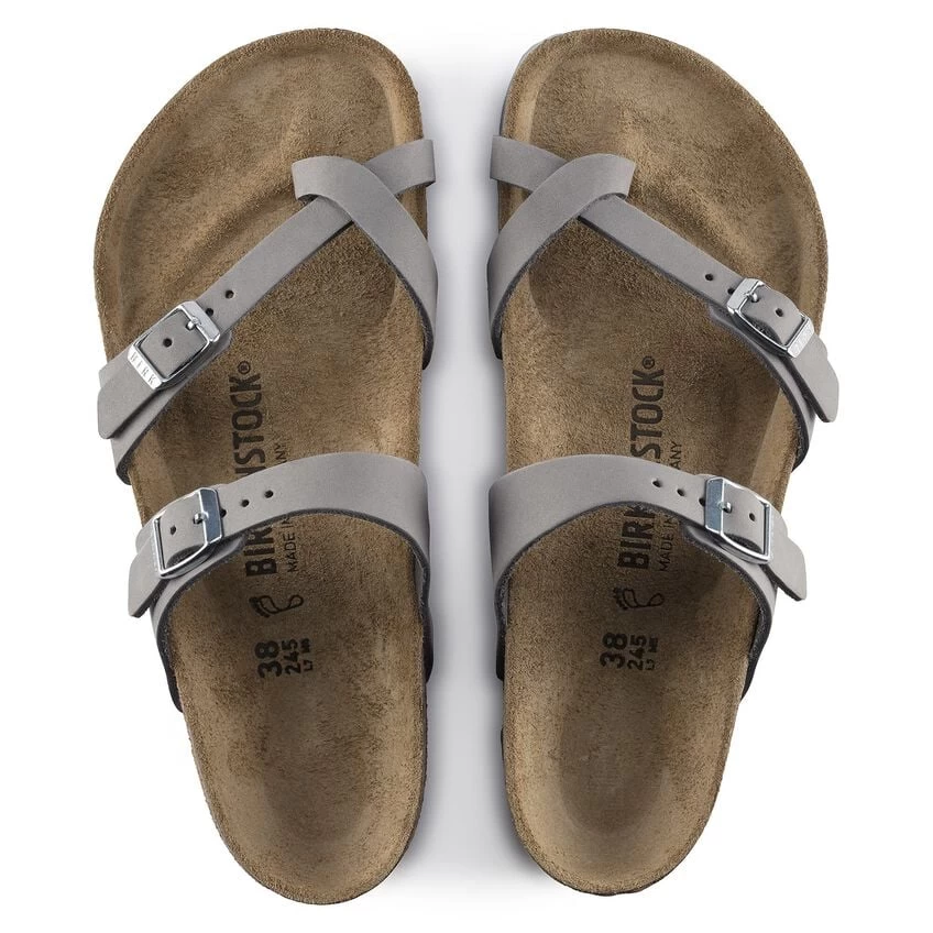 The Mayari from BIRKENSTOCK – an elegantly comfortable sandal with adjustable, crisscrossing straps that form a single loop around the toe. Classic support and adjustability, designed beautifully. The color-coordinated outsole and the buckles round off the shoe’s look. The upper is made from high-quality, especially soft nubuck leather.