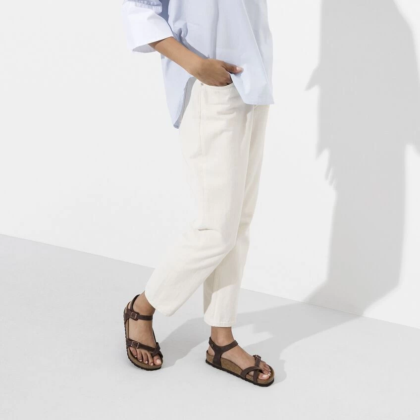 The BIRKENSTOCK Taormina combines a toe loop with an ankle strap to create a delightful, flowing design. The upper is made from extra thick, oiled nubuck leather and features an open-selvage finish.